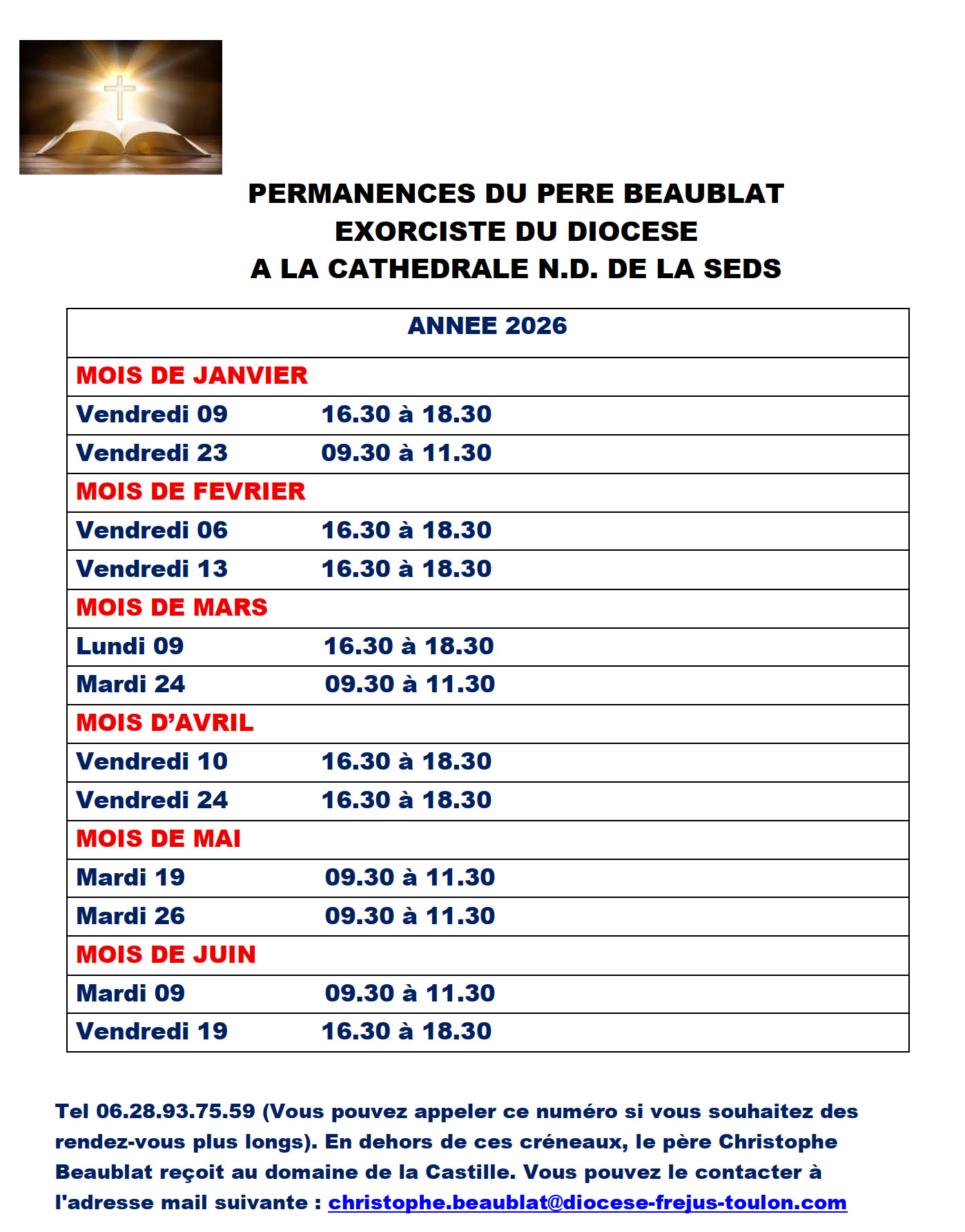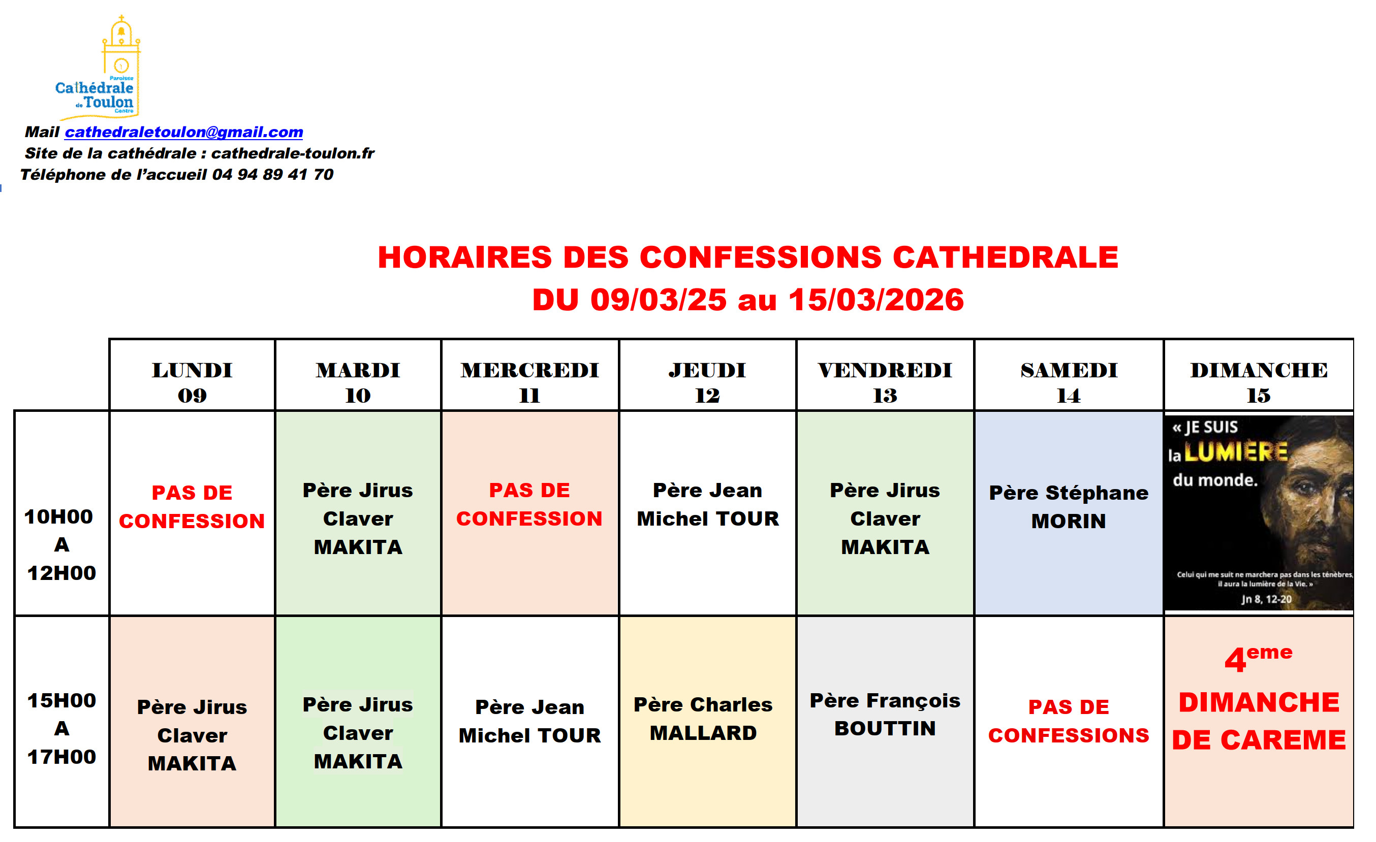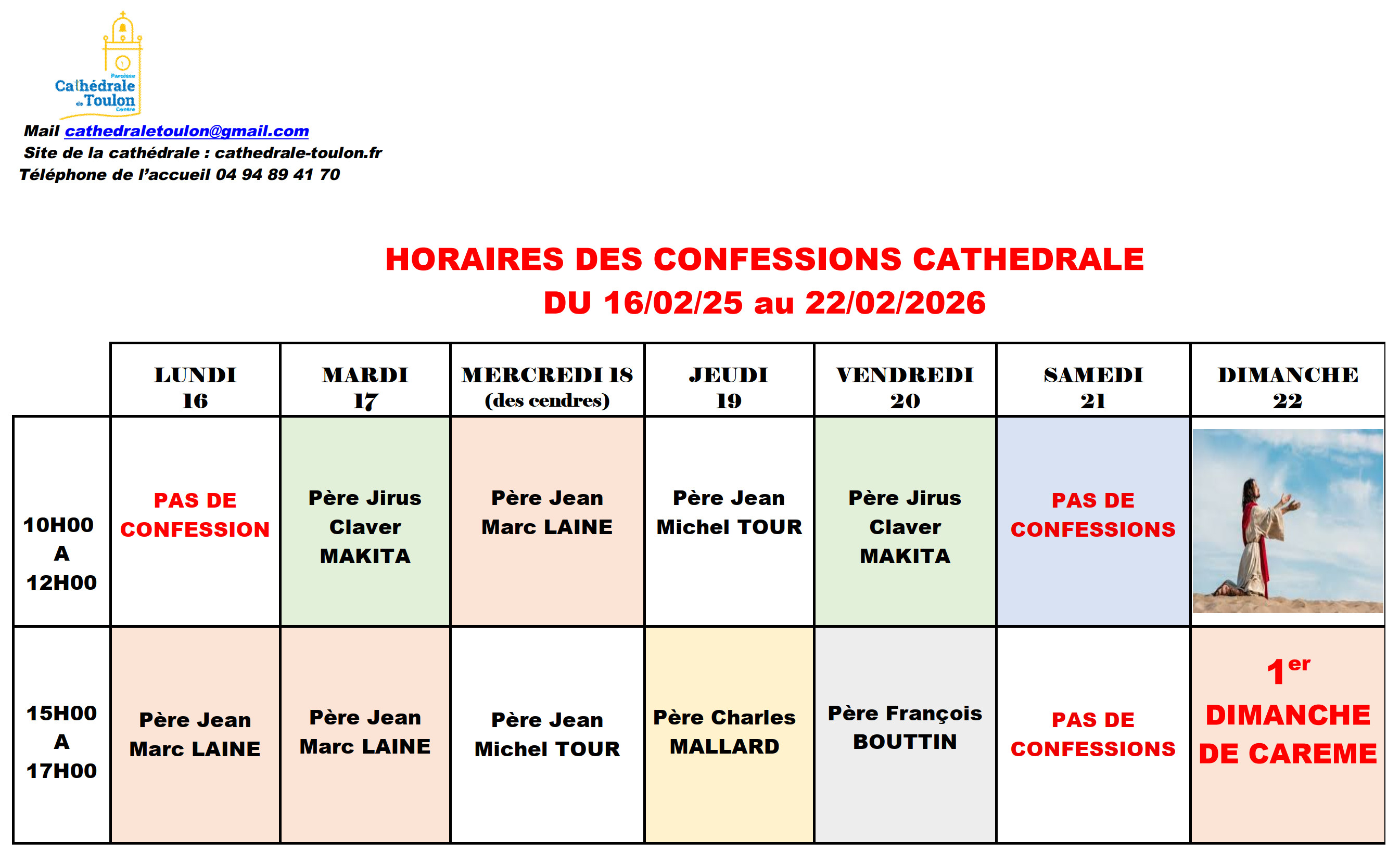 Il est toujours possible de prendre rendez-vous avec un des prĂȘtres de la paroisse pour recevoir ce sacrement en dehors des horaires proposĂ©s. Vous pouvez contacter lâaccueil de la paroisse sur place (l’accueil est ouvert, Ă la CathĂ©drale, du lundi au vendredi de 9h Ă 12h et de 14h30 Ă 18h, le samedi de 9h Ă 12h), par tĂ©lĂ©phone au 04 94 89 41 70 ou transmettre une demande par mail : cathedraletoulon@gmail.com